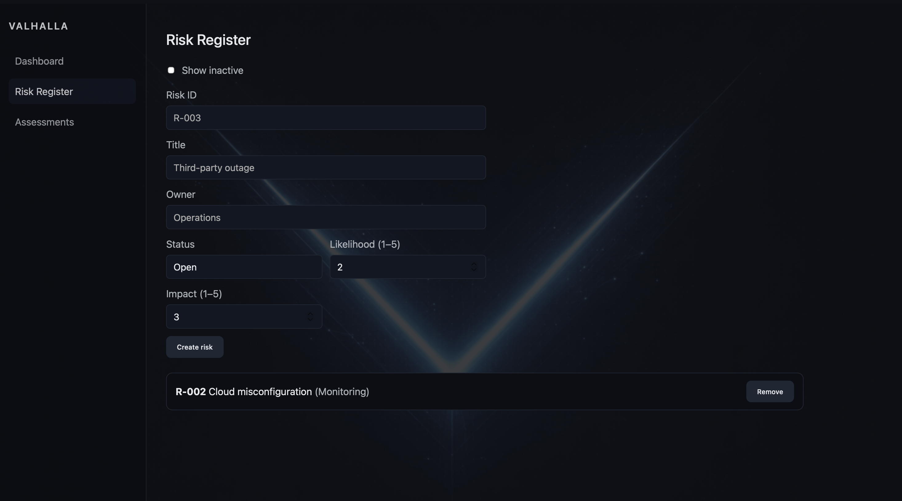 This week was all about the UI for Valhalla and it has come along a lot. We now have a persistent risk register, the ability to make a risk active or inactive, and a check to stop duplications. Oh yeah, it's also called Valhalla and the background looks immense.